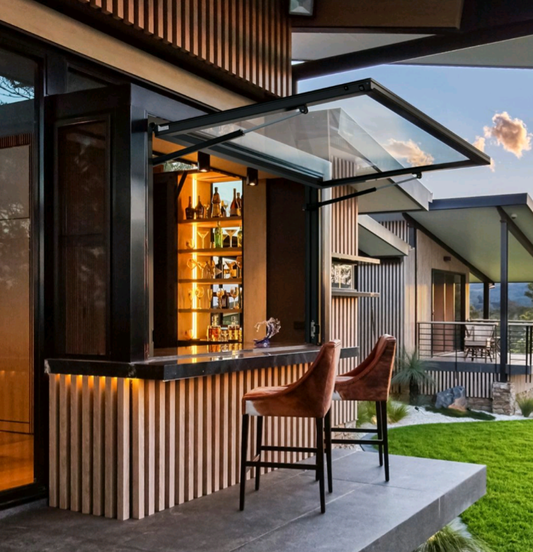 Single-pane servery window system, hinged at the top and operated by motorised struts. Lifts the sash up and outward to create a completely unobstructed opening between indoor and outdoor spaces. Ideal for kitchen-to-patio applications.